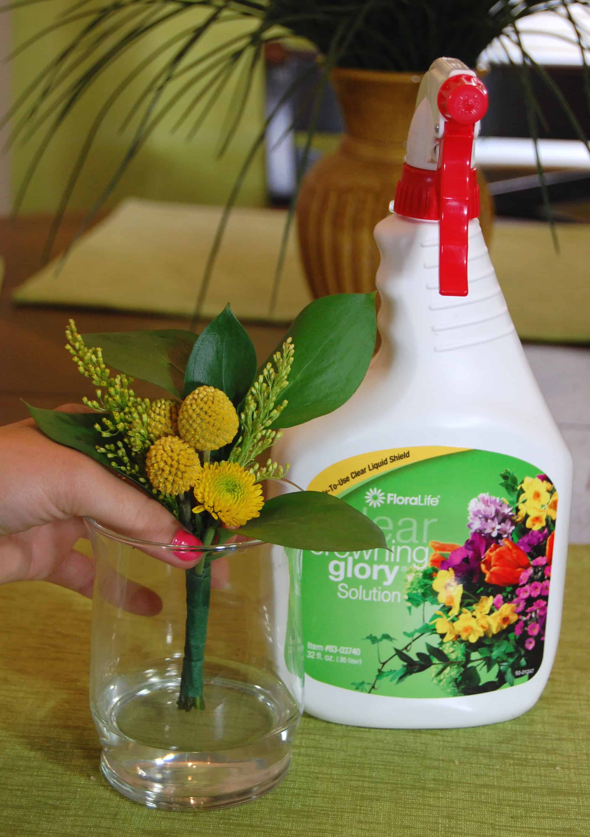 Step Four: Next cut all the stems to the same length. It is time to ensure that your boutonniere will be long lasting! Pour some crowning glory clear solution into a cup or small vase. Dip the end of the corsage into the solution.This will seal the moisture in the stems from the hydration process you did before you started to arrange the flowers. Now grab some pins and your boutonniere is ready to be used!