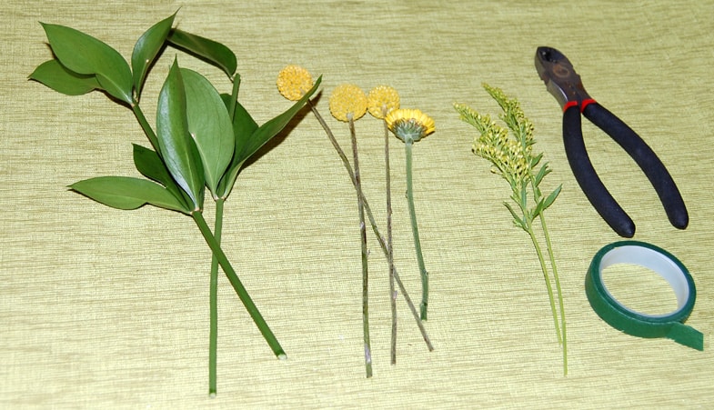 We know you will probably want to make your boutonnieres if you are already doing your own bouquets, centerpieces, and ceremony arrangements so we will show you how to make simple, quick, large boutonnieres! First you will need to grab a couple stems of Israeli Ruscus, 3 stems of Billy Balls, 1 Pompon Button bloom (half closed will add texture), and 2 small pieces of Solidago. Then you need to gather some 1/2″ green floral tape (also used to hold together your bouquets!) and some pliers or floral scissors. You don’t have to buy a floral solution such as Crowning Glory Clear Solution but I highly recommend it because boutonnieres, corsages, and bouquets will last much longer out of water when they have been treated.