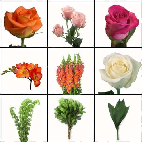 This pack features orange rose miracle, pink spray roses, hot pink rose Cezanne, orange freesia, orange snapdragons, white Eskimo roses, bells of Ireland, pittosporum, and ti leaves. This balanced package is designed to make sure there are shades of oranges, pinks, and white, that balance the look with a professional touch.