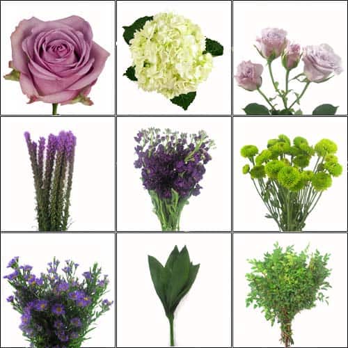 This pack includes Rose Cool Water (lavender rose), Large White Hydrangeas, lavender Spray Roses, Liatris, purple Stock, green Pompon Buttons, purple Monte Casino Asters, Aspidistra, and Huck. The naturally compliments of green in this wedding flower pack are perfectly broken up into shades of purple and white. This pack is perfect for making bouquets, centerpieces, wedding ceremony decor and much more. This combo pack is preferable in the spring and summer months. Order this pack of flowers for a purple wedding color scheme.