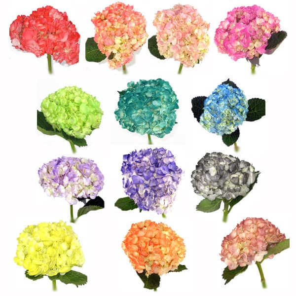 There are many colors and options to get hydrangeas to fit your personal wedding color scheme. There are natural colors such as blue, white, antique or mini green hydrangeas. Or you Check out this vibrant spread of bulk spray-tinted hydrangeas you see below.