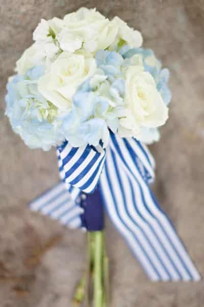 blue and white hydrangea bouquetThis simple bouquet is totally amped up with dark blue striped ribbon. A perfect compliment to the white roses and blue hydrangeas. This sassy look was captured by Glass Jar Photography on Rustic Wedding Chic. Try mixing hydrangeas with roses or other soft, fluffy textured flowers to achieve the above look.