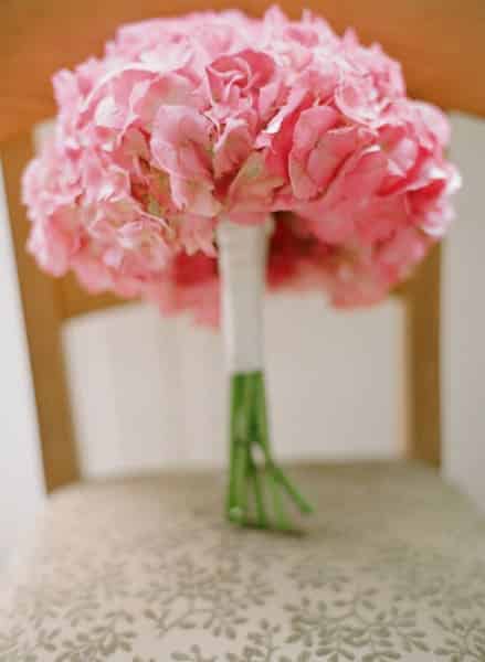 DIY Hydrangea BouquetThis pink hydrangea bouquet is very simple to make. All you need to do is wrap floral tape around 5 stems of 5 pink spray tinted hydrangeas, then use silk ribbon to cover up the mechanics. This photo is featured on Style Me Pretty, photography by Silvana Di Franco Photography.