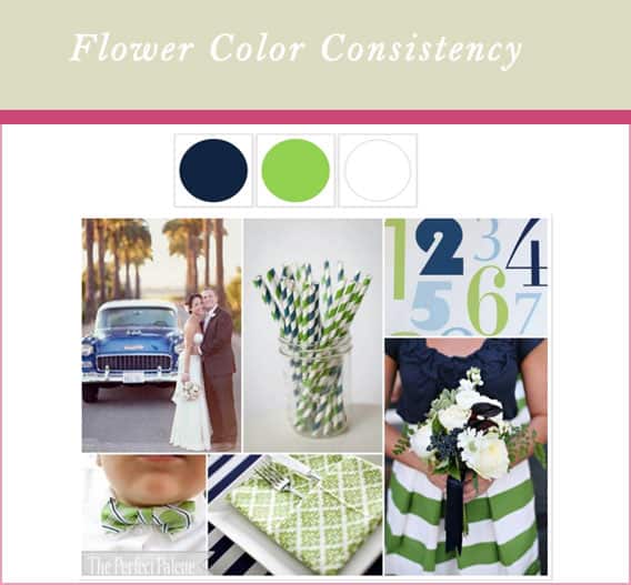 Flower color consistency chartThis color palette above is from theperfectpalette.com, check them out for more inspiration that will get you making perfect color palettes. Using 3 main colors are great for designing a wedding flower design. Flowers are great because they provide extra texture using natural shading. More than 5 colors is usually too cluttered. Also remember that greenery does not count as a color in the palette, greenery is always a great addition and base to all arrangements!