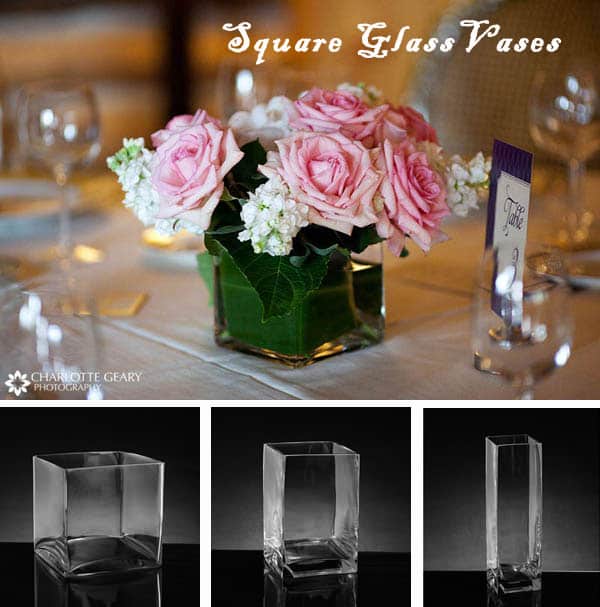 Square Vase OptionsSquare glass vases are also a prime money saver and DIY staple! Take a look at the low centerpiece above. It really does not get much easier than this centerpiece. Put a couple of inches of water in this 4″ by 4″ by 4″ vase. Wrap one aspidistra leaf around the inside of the vase. Keep in mind that there needs to be the right amount of water so that the leaf does not float but if there is too much water no worries, just pour some out. The next step is just placing wholesale roses and double stock in the vase. Rotate the flowers in an interesting pattern that is not uniform to all the arrangements. This may be one of the most simple things you can DIY at your wedding; it can literally only take a few minutes per centerpiece, WINNING!