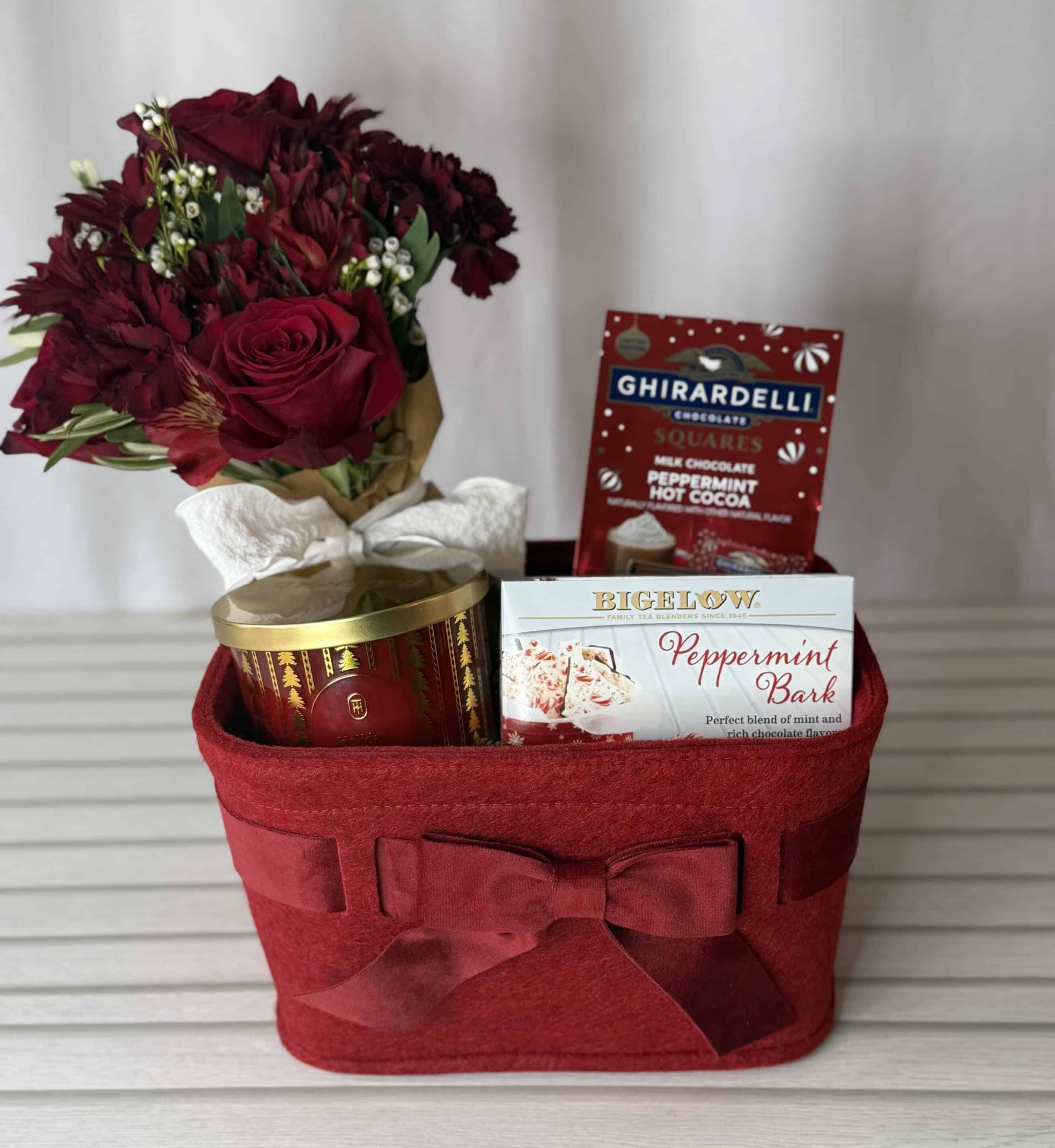 Gift baskets are always a wonderful way to personalize a present. Including items your recipient will love such as treats, candles, or soaps, builds a perfect basket. Seasonal blooms like red roses, white mums, and pine greenery, instantly tie the whole thing together and give it a luxurious and festive feel.